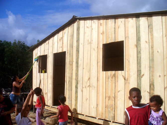 The construction is a temporary shelter, a basic module that can be adapted to the local conditions. This houses only have one room, with 18m2, with prefabricatedwalls and floor in treated pine, and with a cement cover. It is a light structure, but it resists, can be mounted in short time by four volunteers and it can last 10 years.