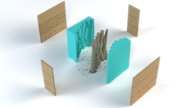 EARTHGRID, is a ventilated and shading facade. Having has base the image of the natural organization of the trees in the forest it comes out the idea of an identic composition with constructive purposes. The trunks, being a structural element of the tree, emerges in a structure that intends to be an integral part of a habitation or a public space. It contains in itself permeable characteristics that articulate with the space, the isolation and ventilation (working like a separation, a division between spaces).