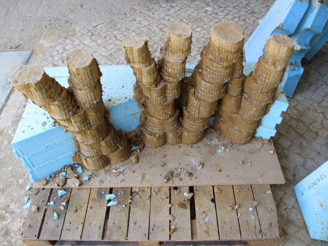 The prototype was made with 1,50 m length by 1,40 m height. Fourteen plates of XPS (extruded polystyrene) were prototyped, with 10 cm height. Then they were stacked one by one, depending on the filling of the earth and joined by a tailgate.